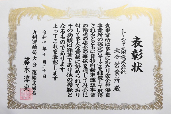 この度大分営業所が、国土交通省九州運輸局大分運輸局長より「安全性優良事業所」として
